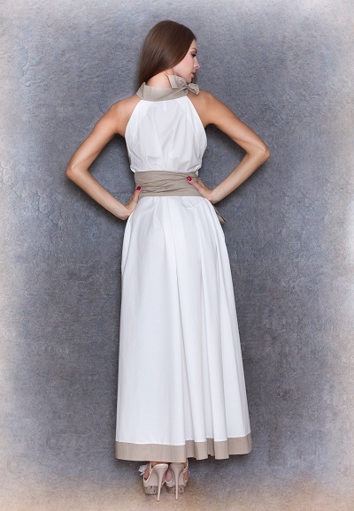 Платье актуальной макси длины, юбка широкая, лиф с американской проймой. Изюминка модели - контрастные, но не яркие полосы отделки низа подола и пройм, перекликающиеся с широким поясом и бантом-завязкой.