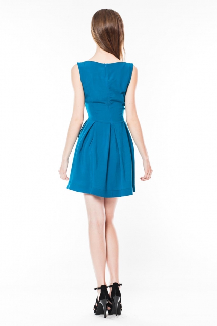 Платье имеет приталенный лиф без рукавов и высокий вырез горловины-лодочка, что придает образу романтичный вид с посылом к ретро-стилю. Юбка платья свободная, образованная широкими складками, длиной выше линии колен. Такой силуэт выглядит очень женственно, подчеркивая талию и придавая бедрам дополнительным объем.