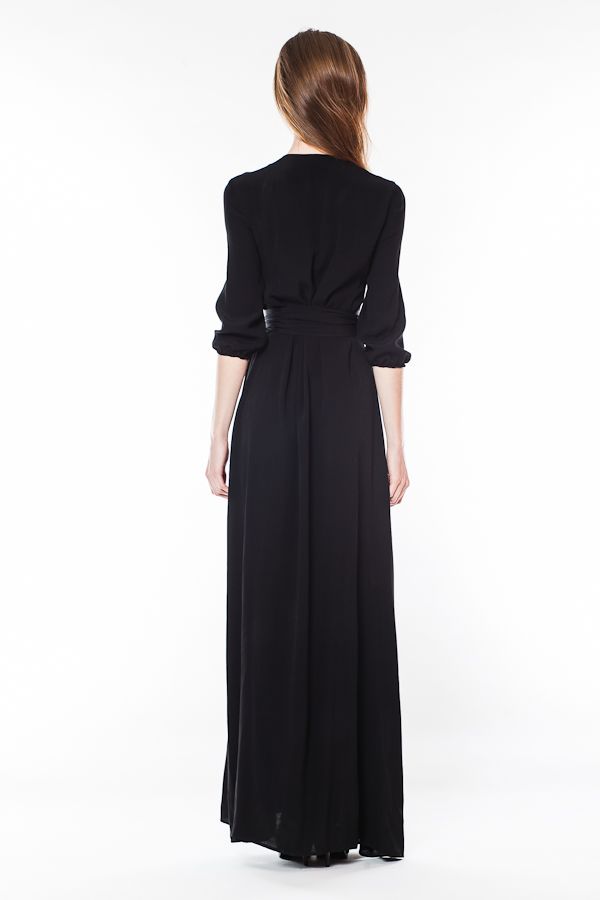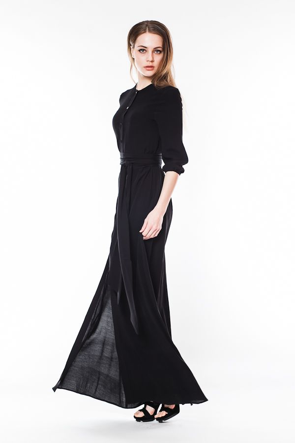 Вам нравится деловой стиль? Вы находите рубашки удобными и красивыми деталями одежды? Обратите внимание на это длинное платье оригинального покроя. Лиф платья выполнен в виде рубашки без воротника и рукавами 3/4 на манжетах. Длинная юбка в пол свободная, по центру - продолжение планки с застежками и высокий разрез. Талия подчеркивается широким поясом.