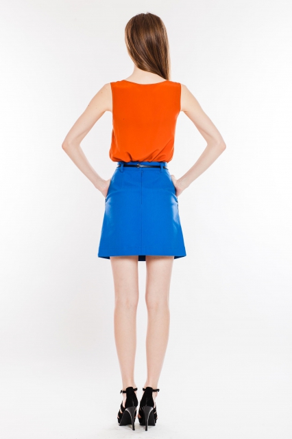 Юбка достаточно короткая, формы "трапеция". Благодаря оригинальным деталям смотрится очень интересно и необычно: большие накладные карманы не только удобны, но и диагональными скосами визуально уменьшают объем талии, плавно переходя в широкие шлевки для ремня.