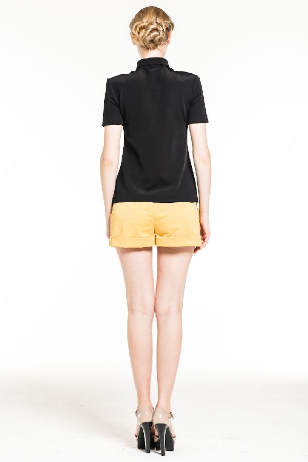 Футболка приталенного покроя, с короткими рукавами, рубашечным воротником. Изюминка модели - высокая планка с пуговицами, расстегнув которые вы создадите глубокий сексуальный вырез.