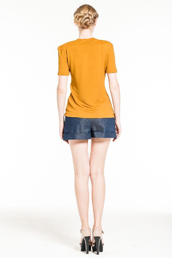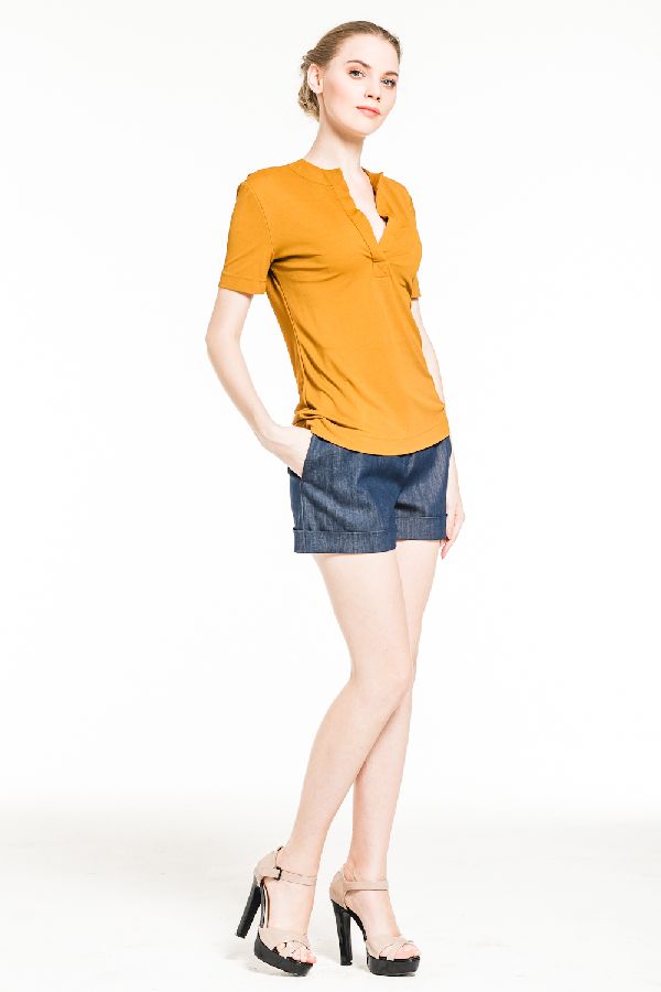 Футболка приталенного покроя, с короткими рукавами. Привлекает внимание оригинальное оформление воротника. Изюминка модели - высокая планка без пуговиц, которая обеспечивает сексуальный глубокий вырез горловины.