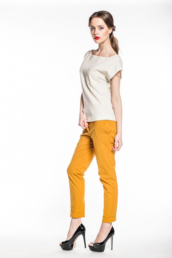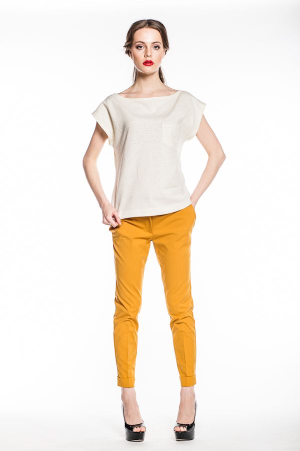 Футболка длиной до середины бедра, это позволяет носить ее и заправленной, и на выпуск. Короткие цельнокроенные рукава приспущены, что придает линии плеч особую мягкость и женственность. Изюминка модели - широкий вырез горловины-лодочка, позволяющий носить блузу на одно плечо, создавая легкий кокетливый образ. К области груди привлекает внимание маенький карманчик.