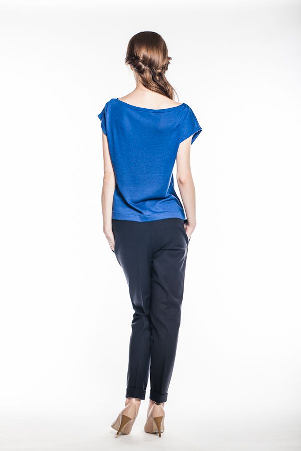 Футболка длиной до середины бедра, это позволяет носить ее и заправленной, и на выпуск. Короткие цельнокроенные рукава приспущены, что придает линии плеч особую мягкость и женственность. Изюминка модели - широкий вырез горловины-лодочка, позволяющий носить блузу на одно плечо, создавая легкий кокетливый образ. К области груди привлекает внимание маенький карманчик.