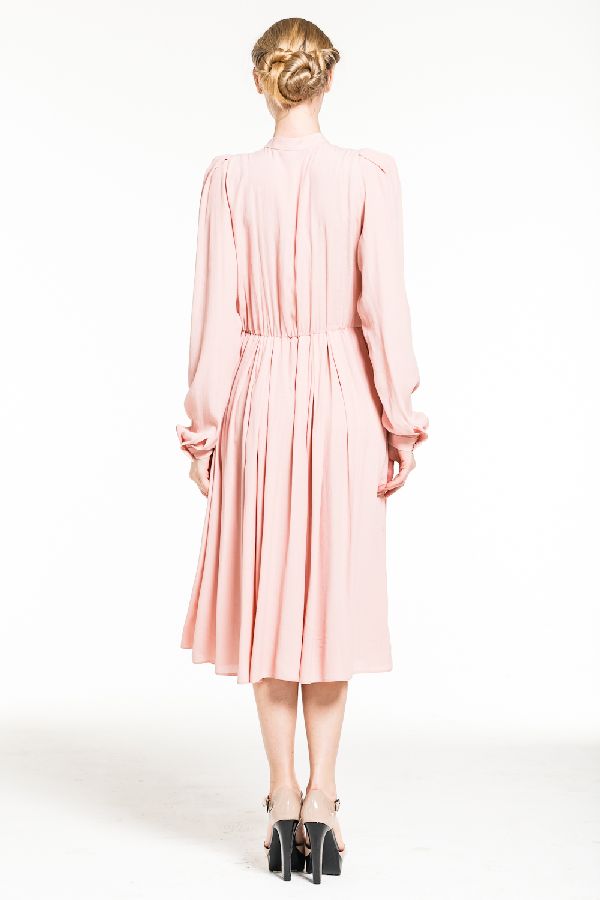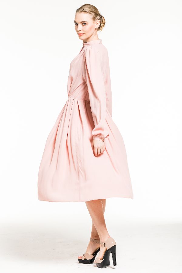 Платье комфортной длины ниже линии колена, с небольшим воротником-стойкой с застежкой спереди и вырезом в виде "капельки", красивым прочтением линии плеч и длинными широкими рукавами на манжетах. Свободный силуэт, присобранный с помощью тонкого ремешка, создает мягкую красивую драпировку, делая ваш образ романтичным и невероятно элегантным.