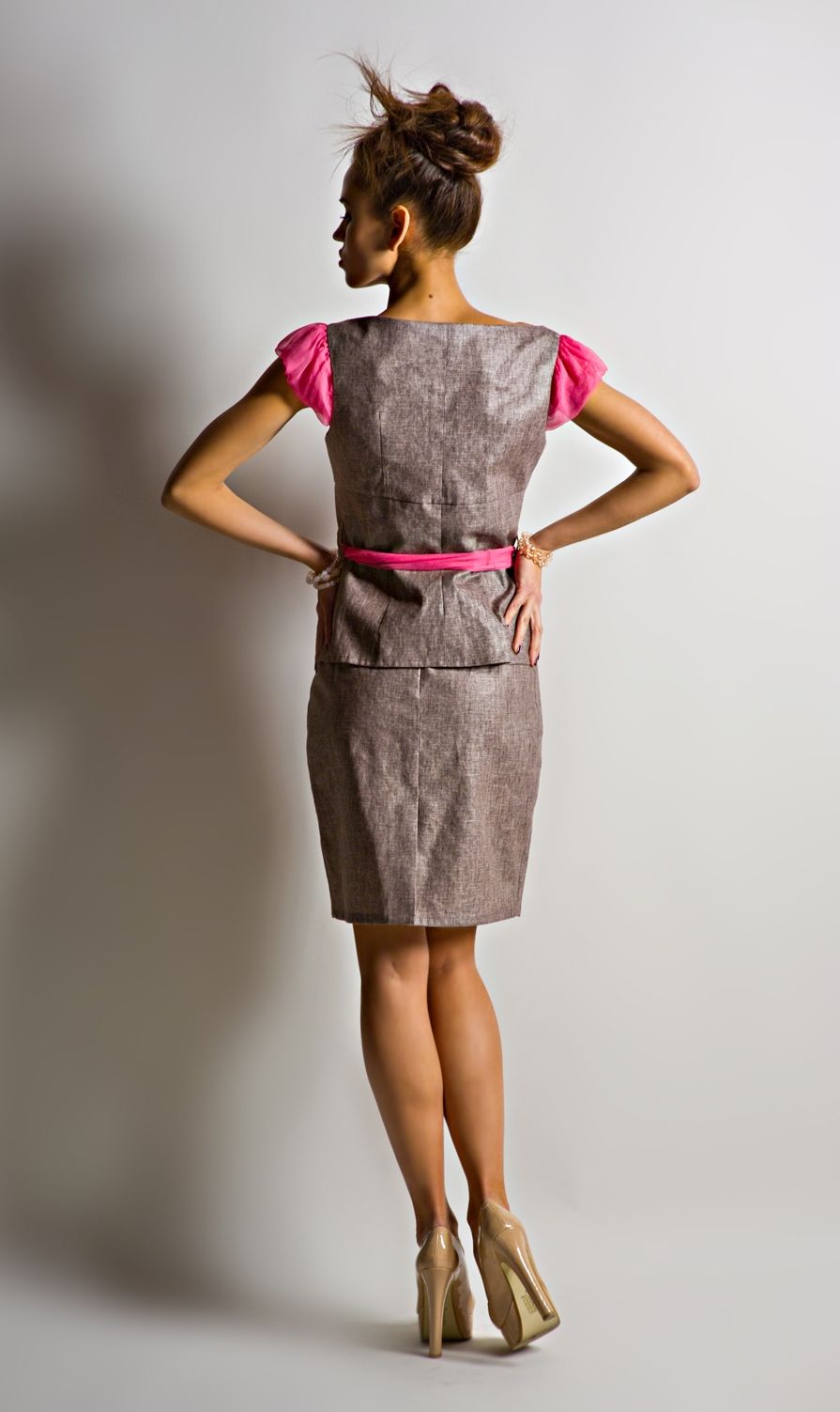 Вырез горловины – глубокая лодочка. Блуза застёгивается спереди на несколько мелких розовых пуговиц. В ней вы всегда будете в центре внимания!