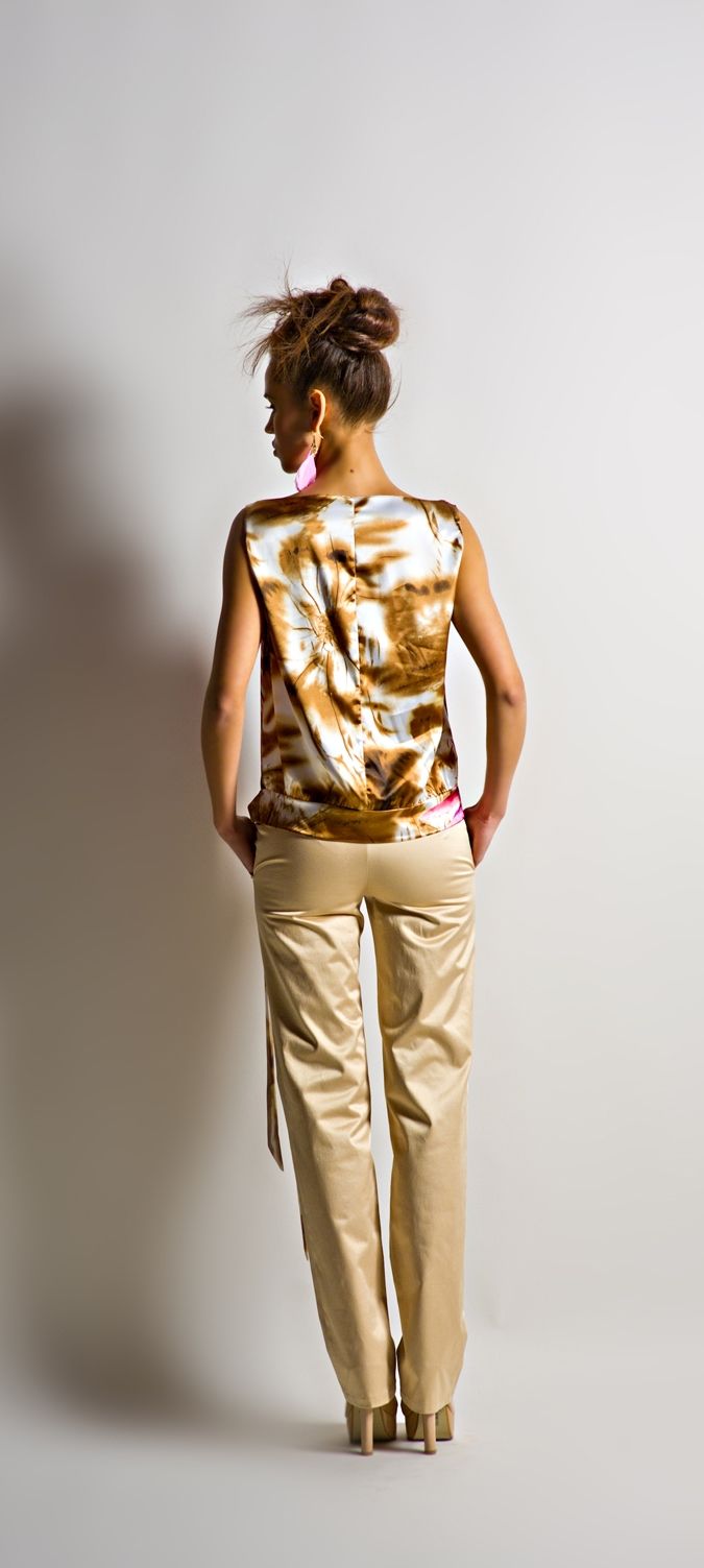 Брюки относительно свободные в верхней части, но не очень. Неширокая кокетка позволяет модели держаться на бёдрах. Там же расположена небольшая пуговица. Застёгиваются брюки на потайную молнию – спереди. По бокам имеются стильные карманы.
