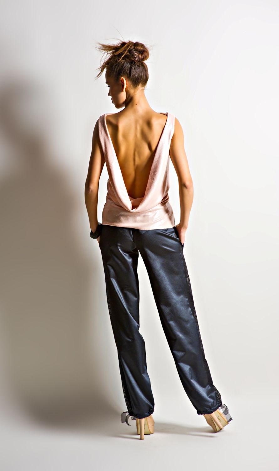 Топ отличается своим уникальным фасоном и замысловатым покроем. Длина изделия – до середины линии бедра. Вырез горловины – лодочка. Это позволяет акцентировать внимание на стройной шее.