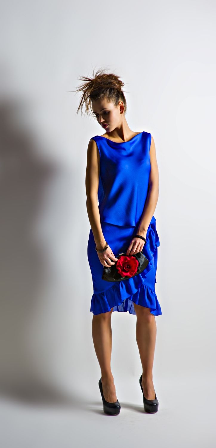 Стильная ярко-синяя юбка, созданная из натурального атласа и шифона, отличается своим деловым стилем вкупе с некой кокетливостью.