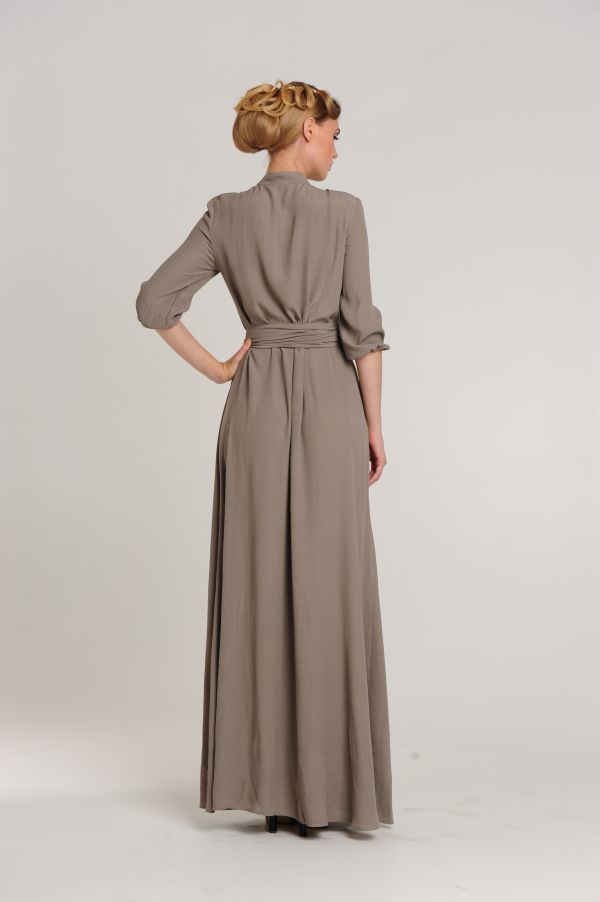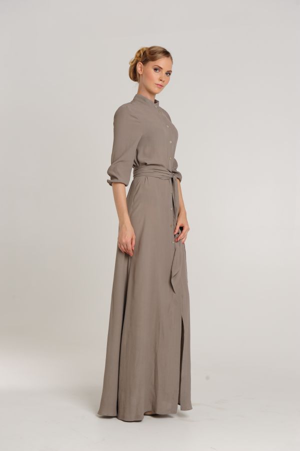 Вам нравится деловой стиль? Вы находите рубашки удобными и красивыми деталями одежды? Обратите внимание на это длинное платье оригинального покроя. Лиф платья выполнен в виде рубашки с воротником-стойкой и рукавами 3/4 на манжетах. Длинная юбка в пол свободная, по центру - продолжение планки с застежками и высокий разрез. Талия подчеркивается широким поясом.