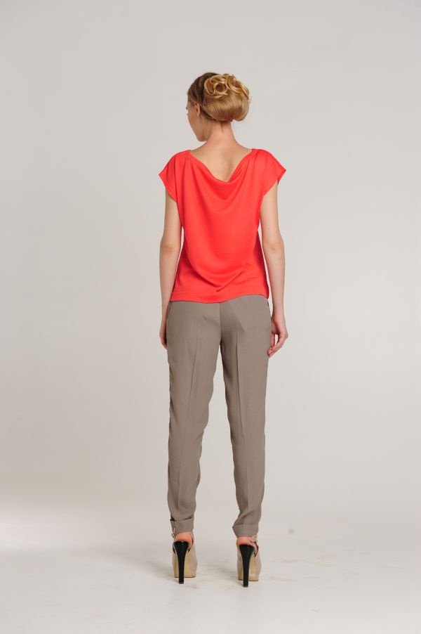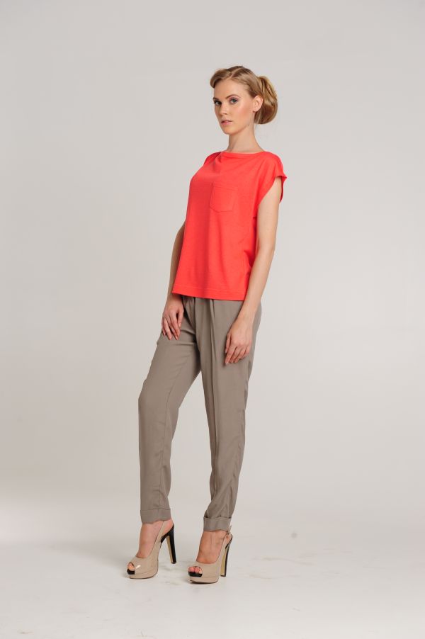 Футболка длиной до середины бедра, это позволяет носить ее и заправленной, и на выпуск. Короткие цельнокроенные рукава приспущены, что придает линии плеч особую мягкость и женственность. Изюминка модели - широкий вырез горловины-лодочка, позволяющий носить блузу на одно плечо, создавая легкий кокетливый образ. К области груди привлекает внимание маленький карманчик.