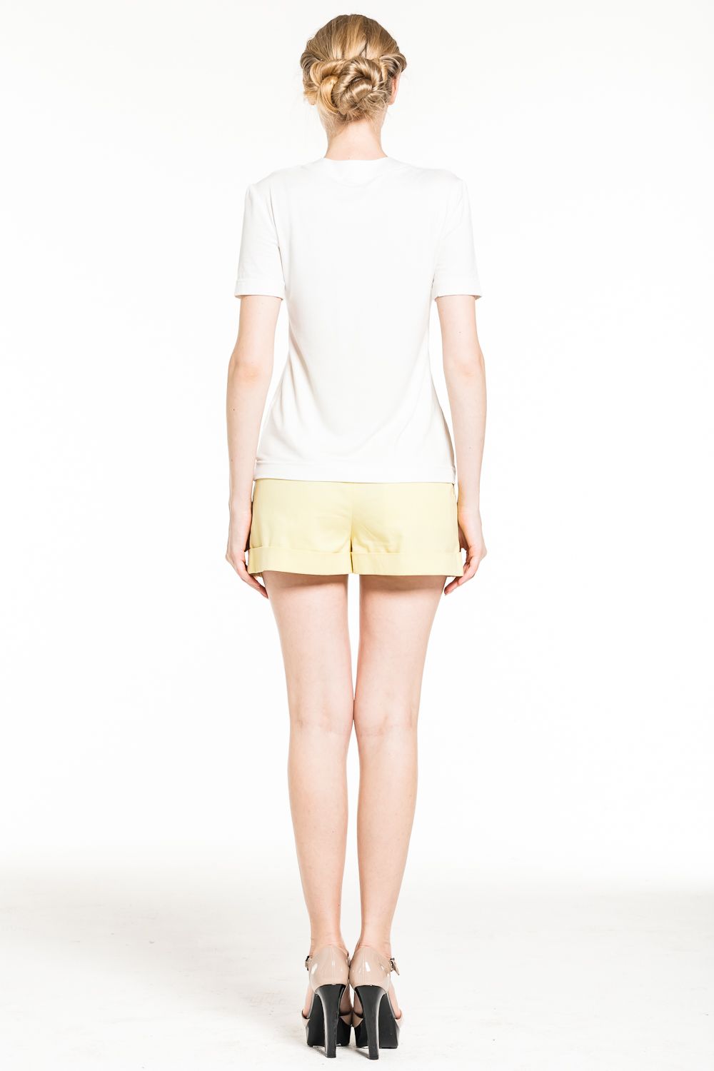 Футболка приталенного покроя, с короткими рукавами. Привлекает внимание оригинальное оформление ворота. Изюминка модели - высокая планка без пуговиц, которая обеспечивает сексуальный глубокий вырез горловины.
