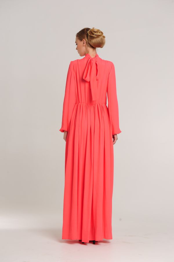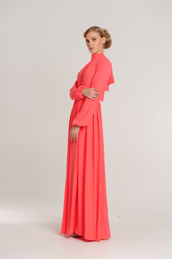 Платье длинное, в пол, с длинными широкими рукавами на манжетах. Оригинальный покрой создает волнующую драпировку, которая расходится лучами от воротника-стойки и превращается в широкую юбку. Сзади воротник продолжается женственным бантом. Вертикальные складки не только смягчают достаточно строгий образ, создаваемый этим платьем, но и прекрасно стройнят и удлиняют силуэт.