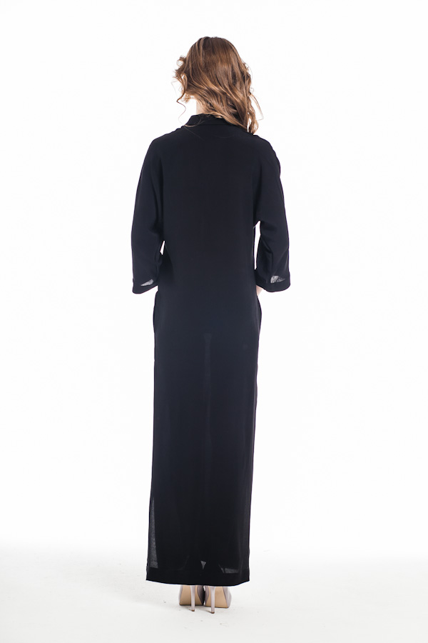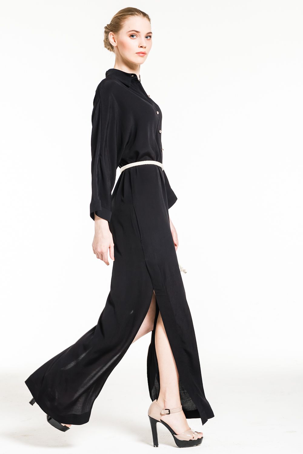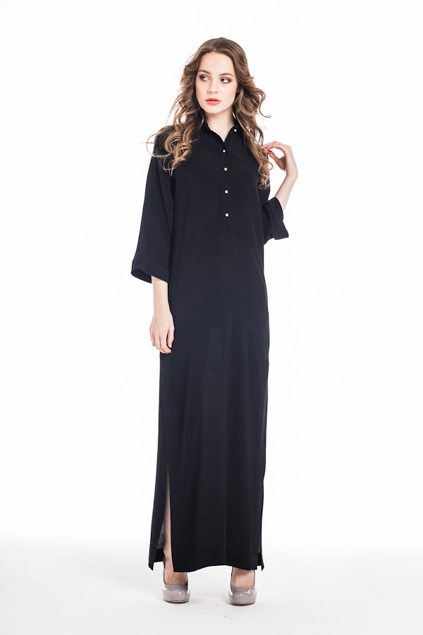 Супер актуальная макси длина, прямой стройнящий покрой, верх в строгом рубашечном стиле с планкой и широкими рукавами 3/4 и неожиданные, дразнящие, интригующие высокие разрезы по бокам, открывающие стройные ноги во время ходьбы и при малейших дуновениях ветра - от вас невозможно отвести глаз!