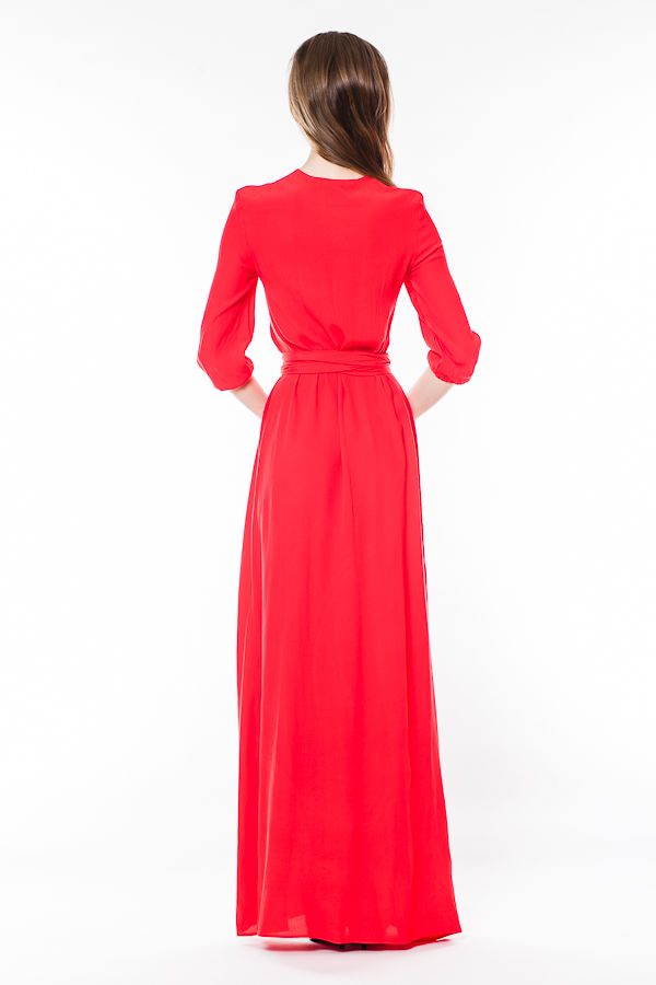 Вам нравится деловой стиль? Вы находите рубашки удобными и красивыми деталями одежды? Обратите внимание на это длинное платье оригинального покроя. Лиф платья выполнен в виде рубашки без воротника и рукавами 3/4 на манжетах. Длинная юбка в пол свободная, по центру - продолжение планки с застежками и высокий разрез. Талия подчеркивается широким поясом.