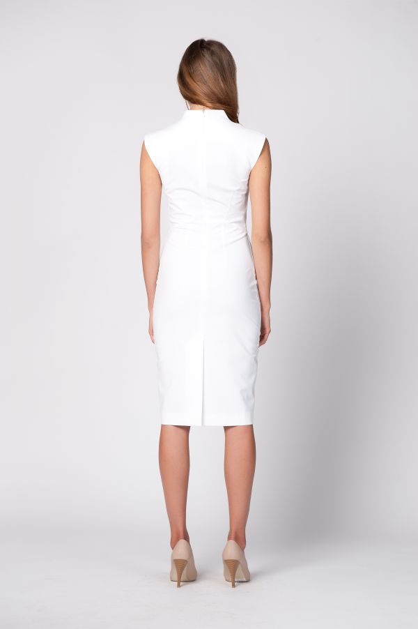 Элегантное платье-футляр лаконичного покроя станет прекрасным дополнением вашего делового гардероба. Прямые линии, спокойная и актуальная миди длина прекрасно гармонируют с острым глубоким вырезом и воротником-стойкой. Сзади предусмотрена удобная застежка-молния и небольшой разрез.