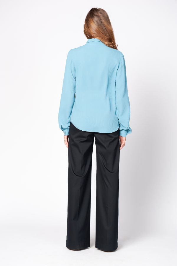 Блуза выполнена из натурального материала свежего голубого оттенка, что позволяет легко комбинировать ее с вашей любимой одеждой разных цветов.