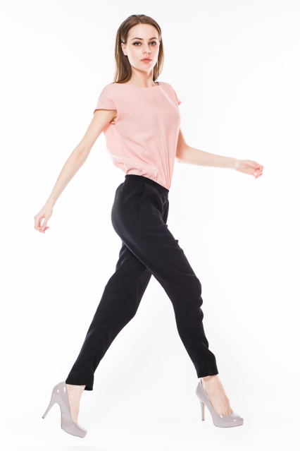 Брюки зауженные, но при этом не стесняющие движений, покрой на резинке дарит дополнительное удобство и безупречную посадку по фигуре. Актуальный оттенок добавляет нотку шика в повседневную жизнь и в то же время достаточно сдержан, что позволяет использовать брюки и в качестве детали офисного наряда.