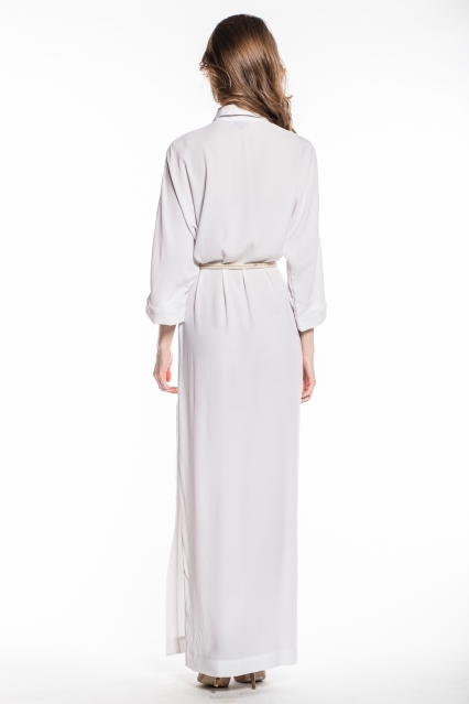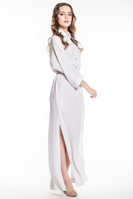 Супер актуальная макси длина, прямой стройнящий покрой, верх в строгом рубашечном стиле с планкой и широкими рукавами 3/4 и неожиданные, дразнящие, интригующие высокие разрезы по бокам, открывающие стройные ноги во время ходьбы и при малейших дуновениях ветра - от вас невозможно отвести глаз!