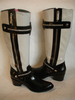 Сапоги из молочной глянцевой кожи с черными хлястиками на голенище и стразами на подъеме.